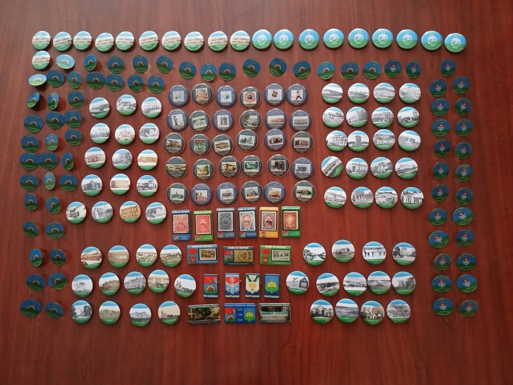 Первым вкладом ИЯЛИ ФИЦ Коми НЦ УрО РАН в подготовку к празднованию и популяризацию истории Сыктывкара можно считать выпущенные институтом малотиражные серии коллекционных значков. На серии из четырех значков «Гербы города» изображены первый герб Усть-Сысольска 1780 года, герб советского Сыктывкара 1978 года и два герба города постсоветской эпохи: 1993 и 2005 годов. На значках большой серии «Историческая топонимия» запечатлены названия населенных пунктов и местечек, расположенных или ранее находившихся на территории Сыктывкара и Эжвы (Больничный городок, Веждино, Владивосток, Вичкодор, Пычкасты, Сидорполой, Слобода, Строитель, Тентюковская запань, Чугунгрезд, Ягвыв и др.). Серия «История Сыктывкара» к настоящему времени включает значки с историческими фотографиями города, распределенные по четырем разделам: «Начало ХХ века» (13 значков), «1920-е годы» (13 значков), «1930-е годы» (16 значков) и «1940-е годы» (20 значков). Выпущены значки с изображением марок усть-сысольской земской почты, а также значки с изображением марок Почты СССР, посвященных Сыктывкару. Двумя значками Сыктывкар представлен в небольшой серии «Города Республики Коми: век нынешний и век минувший» (современное фото и фото середины ХХ столетия).